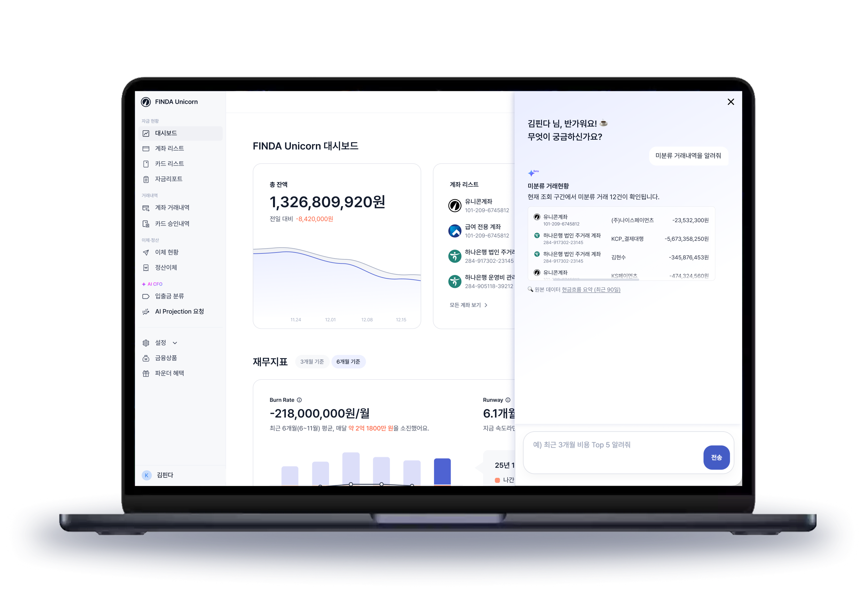 "이번 달 마케팅비 얼마 썼어?" "사람 한 명 더 뽑으면 런웨이가 어떻게 돼?" 우리 회사 데이터 위에서 대답하는 AI CFO입니다.